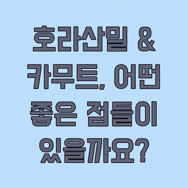 A. 카무트는 호라산밀 품종 중 하나로, 특정 브랜드나 재배 지역을 지칭하는 경우가 많아요. 효능이나 영양 성분 면에서는 거의 동일하다고 보시면 됩니다!